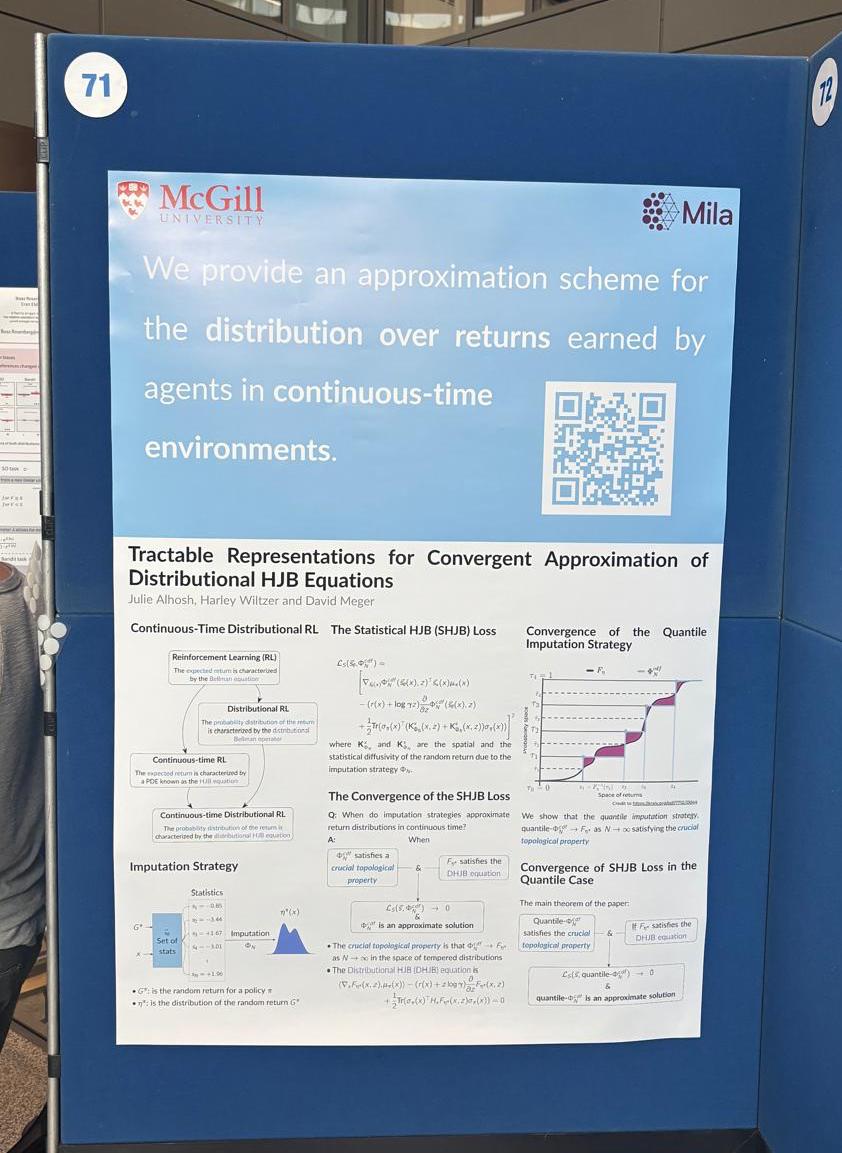 One of the highlights was presenting my paper, Tractable Representations for Convergent Approximation of Distributional HJB Equations. This paper provides Sharing this research and getting feedback from conference attendees was an incredibly rewarding experience.